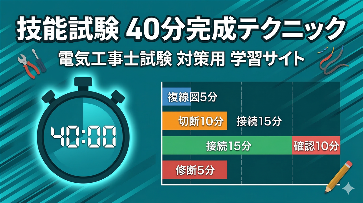 対策:時間配分が重要です。複線図に5分、作業に30分、確認に5分が目安。最後の5分でセルフチェックする余裕を持ちましょう。