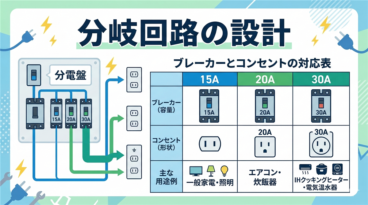 • 分岐回路:ブレーカーの定格に応じて電線の太さとコンセントの定格が決まる