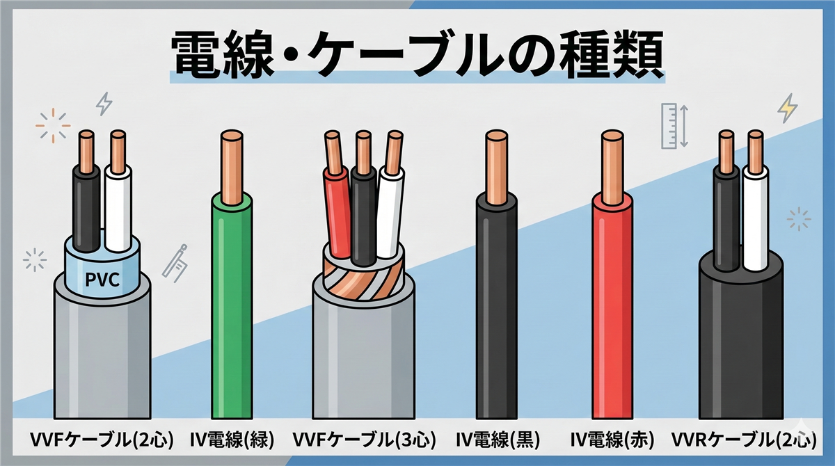 - コンセント → 一般用(15A)、接地極付き(水回り・屋外)、接地端子付き(ねじ止めアース)、抜け止め・引掛形(抜け防止)、20A/30A(大容量機器用)、防水(屋外用)