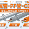 次のステップとして、「金属管工事・PF管工事・CD管工事をわかりやすく解説」や「金属線ぴ工事・金属ダクト工事」も学んでいきましょう。配線図の読み方と組み合わせると理解が深まります。「配線図の図記号一覧」もあわせてチェックしてみてください。