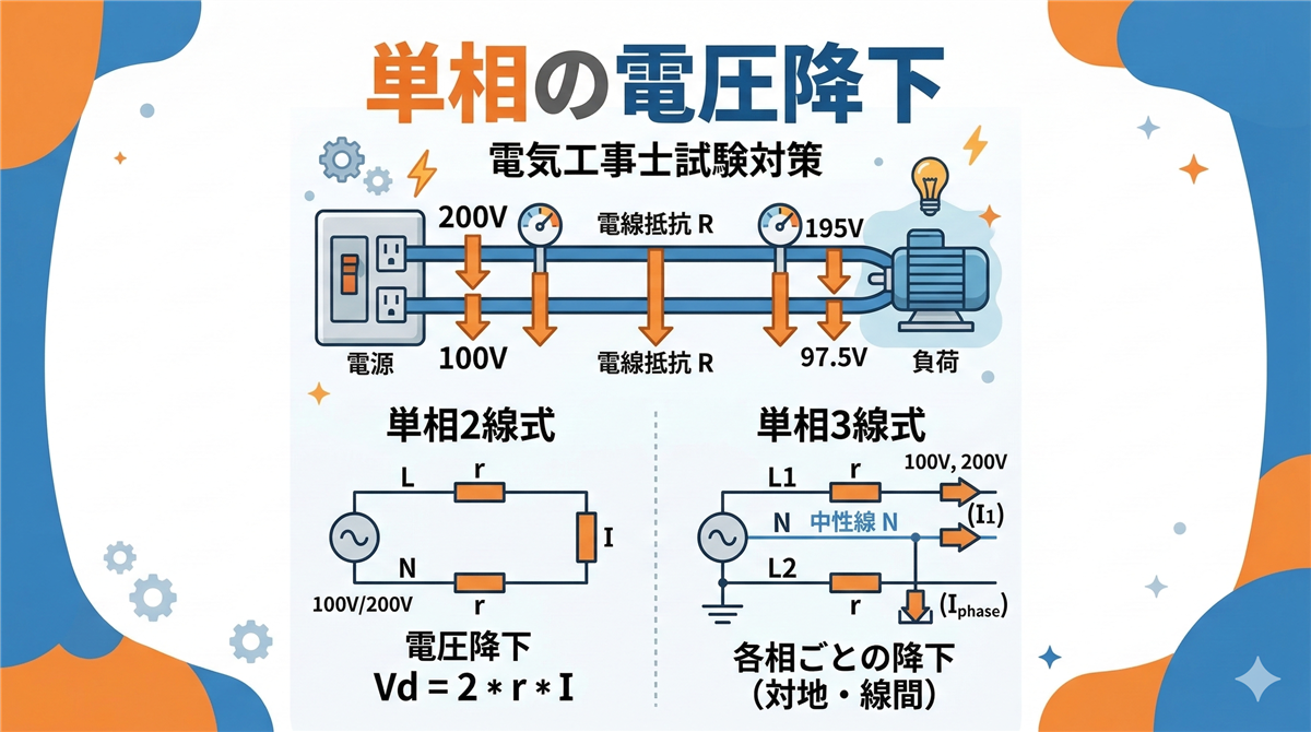 この記事でわかること 電圧降下の原因と現場で問題になる理由 単相2線式の電圧降下の公式(e=2Ir)の導き方と使い方 単相3線式の電圧降下の公式と平衡・不平衡の違い 試験に出る電圧降下の計算問題の解き方のコツ 結論から言います:電圧降下とは「電線を通る間に電圧が目減りすること」 結論から言います。電圧降下(でんあつこうか)とは、電源から負荷(ふか=電気を使う機器)まで電線を通る間に、電線自体の抵抗(ていこう)によって電圧が下がる現象のことです。 コンセントの電圧は100Vのはずなのに、長い電線の先では95 ...