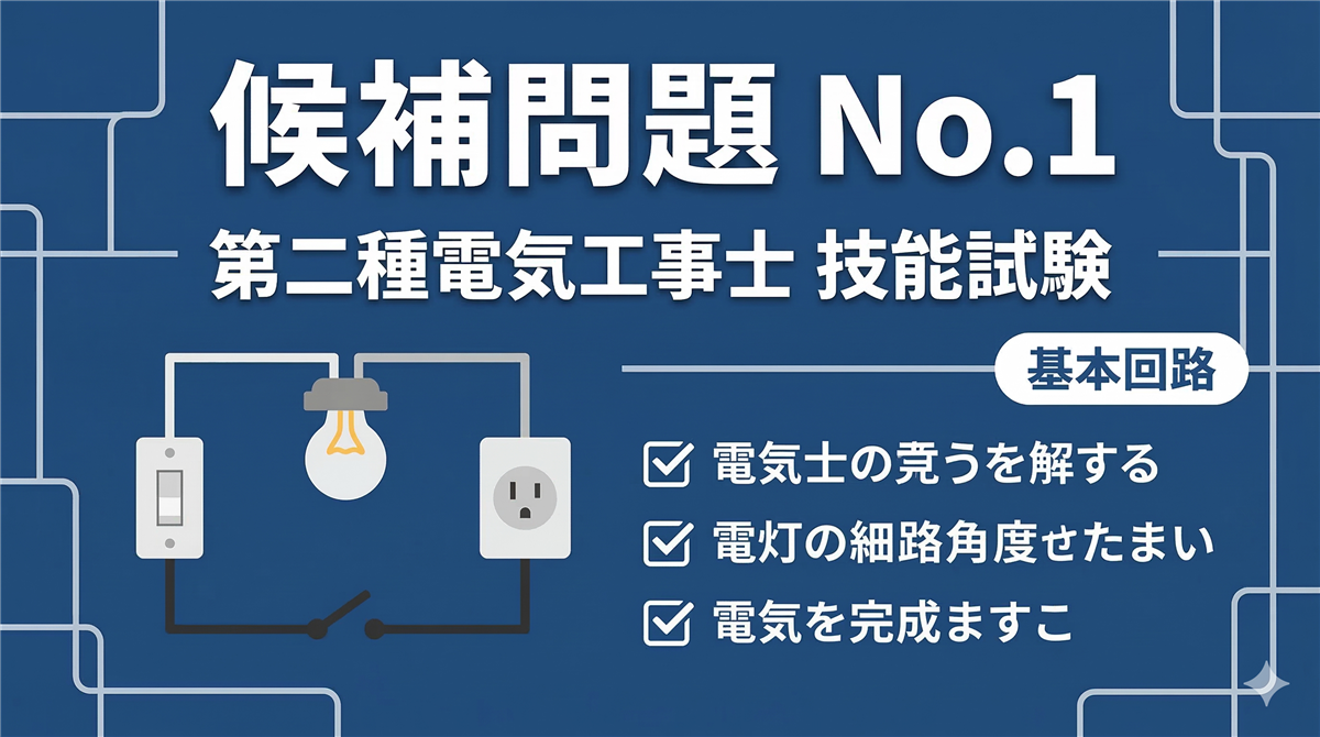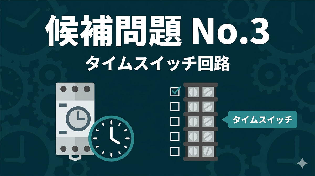 この記事でわかること No.3のタイムスイッチ回路の仕組みと端子構成 端子台(S1/S2/L1)への正しい接続方法 タイムスイッチ+片切スイッチの複線図の書き方 端子台接続で欠陥になりやすいポイントと対策 結論から言います 候補問題No.3は、タイムスイッチが登場する回路です。タイムスイッチは実技作業としては端子台に電線を接続するだけなので、仕組みさえ理解すれば難しくありません。 No.3のポイント 特徴:タイムスイッチ(端子台で代用)が含まれる回路難易度:中程度(タイムスイッチの端子の意味を理解する必要 ...