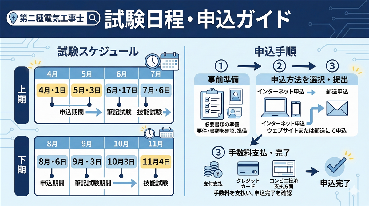 第二種・第一種電気工事士の受験ガイド。合格率・試験日程・勉強法・おすすめ参考書・試験当日の持ち物・免状申請まで網羅。
