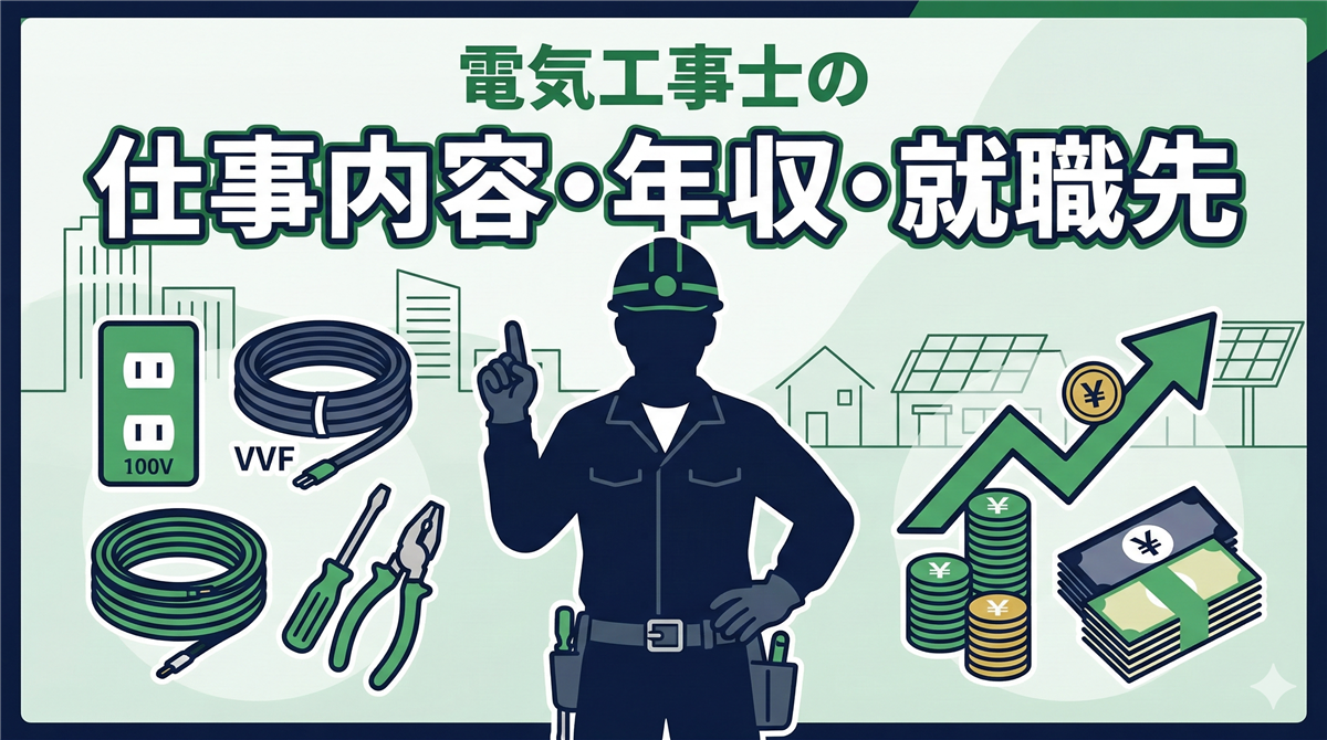 この記事でわかること 電気工事士の6つの仕事内容(新築・リフォーム・エアコンなど) 年収の目安と経験年数による変化(350万〜700万円以上) 就職先の種類と選び方(電気工事会社・ビルメン・独立開業) 電気工事士の将来性と需要が高い理由 結論から言います 電気工事士は、建物の電気設備を設計・施工・保守する専門職です。住宅のコンセント取り付けからビルの高圧受電設備の管理まで、活躍の場は非常に幅広く、年収は経験や働き方によって350万〜700万円以上まで大きく変わります。 「資格を取ったら、実際にどんな仕事を ...